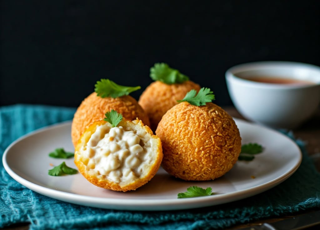 Misture a mandioca, o ovo e o queijo coalho. Forme bolinhos e recheie com a palmito refogada com a cebola. Frite em óleo quente.