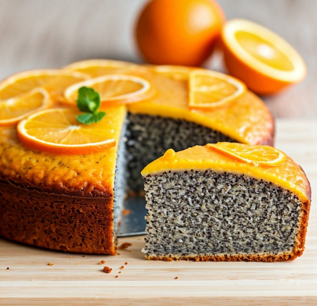 Um bolo refrescante e delicado, com a acidez da laranja combinada com o crocante das sementes de papoula.