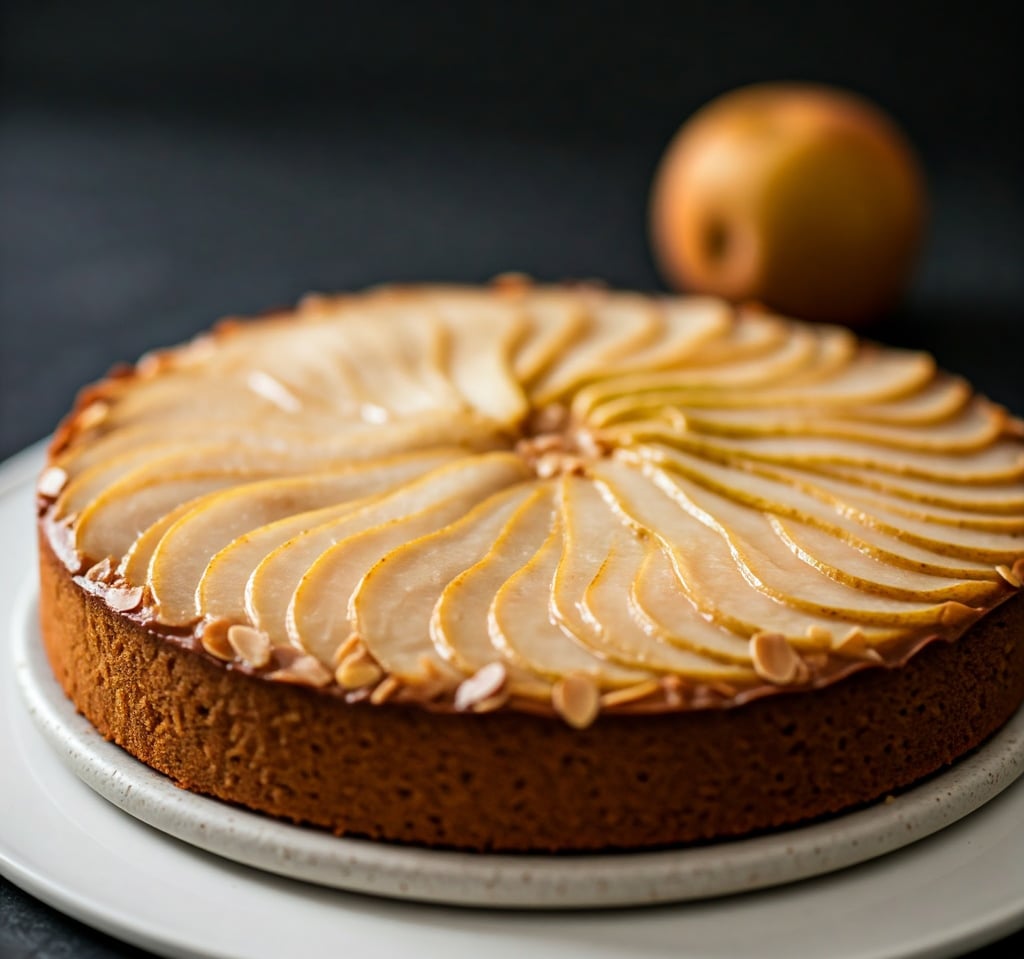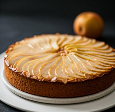 Um bolo delicado e sofisticado, com o sabor suave da pera e a crocância das amêndoas, perfeito para ocasiões especiais.