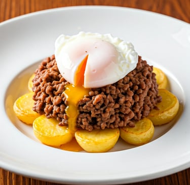Carne Moída à Portuguesa com Batatas e Ovo Pochê