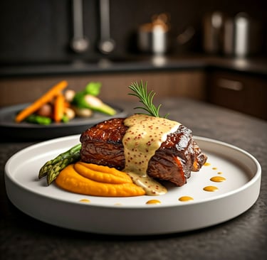 Costela Bovina com Purê de Batata Doce e Molho de Mostarda