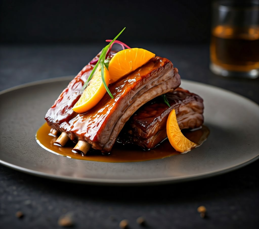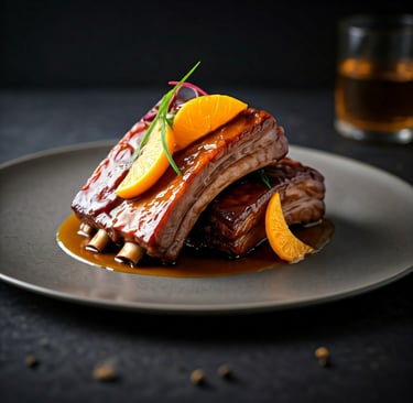 Uma costela suína assada até a perfeição, com o equilíbrio entre o doce do mel e o ácido da laranja, criando uma combinação de sabores irresistíveis.