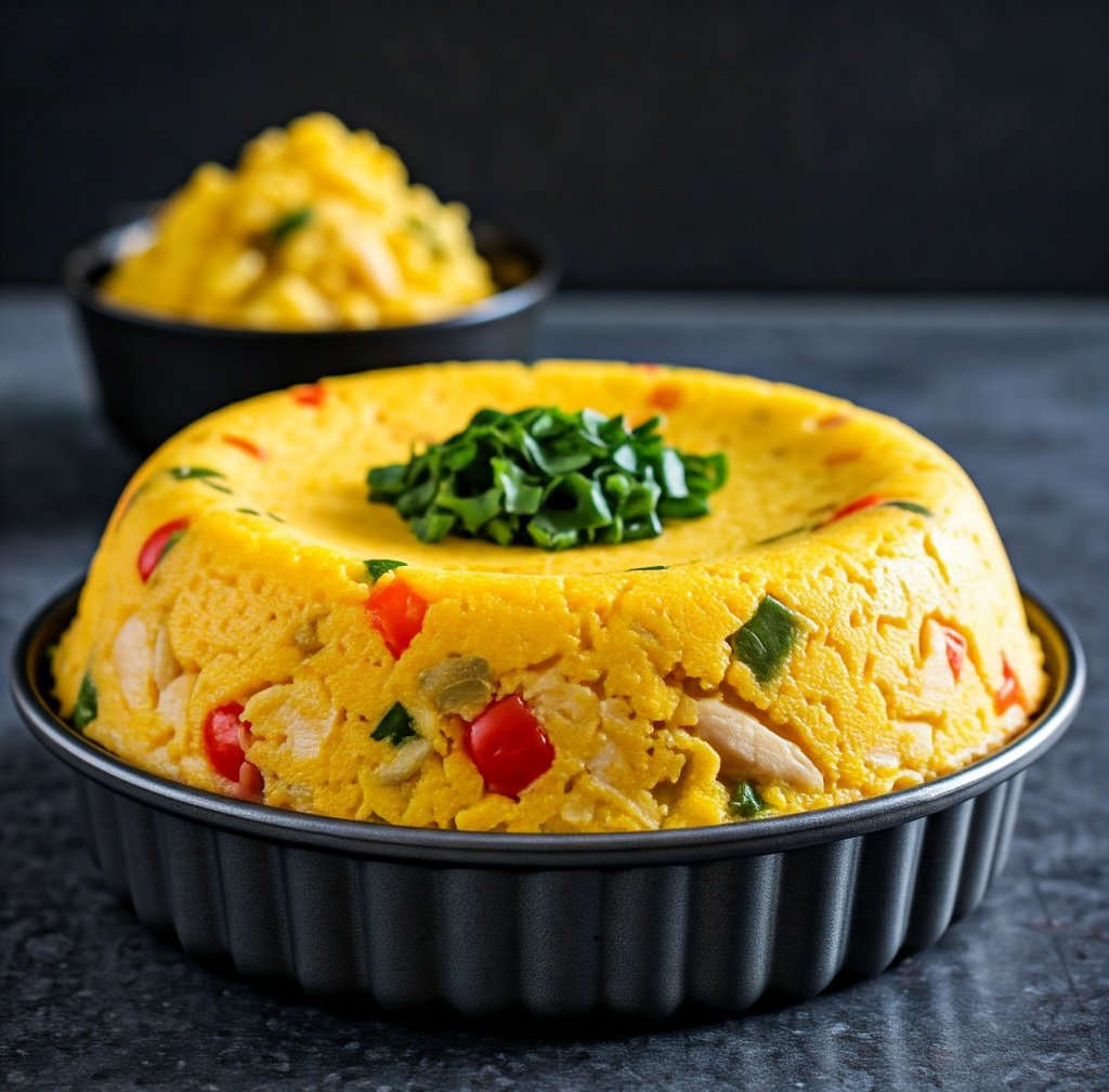 Uma versão rica e saborosa do cuscuz paulista, com a suavidade do fubá, recheado com frango desfiado e legumes.