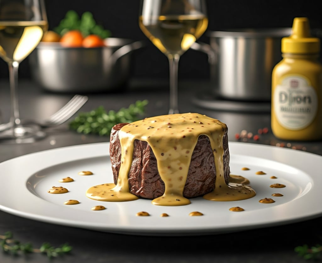 Em uma panela pequena, derreta a manteiga e acrescente a mostarda Dijon, mexendo bem.