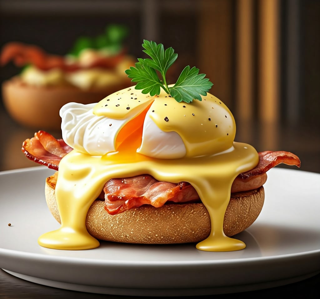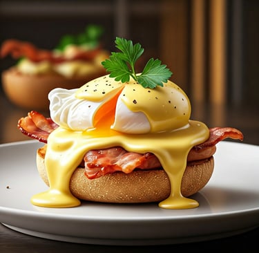 O clássico ovo benedict com um toque de bacon crocante, servido com o tradicional molho hollandaise.