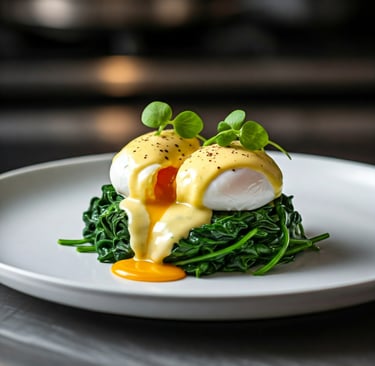 O clássico brunch com um toque sofisticado, ovos pochê e espinafre cremoso, regados com molho holandês delicado.