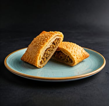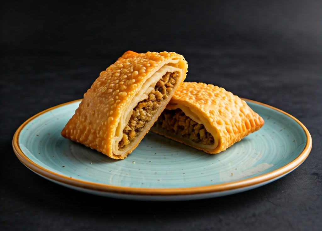 Um pastel crocante de fubá, recheado com carne seca desfiada e catupiry, perfeito para um lanche gourmet.
