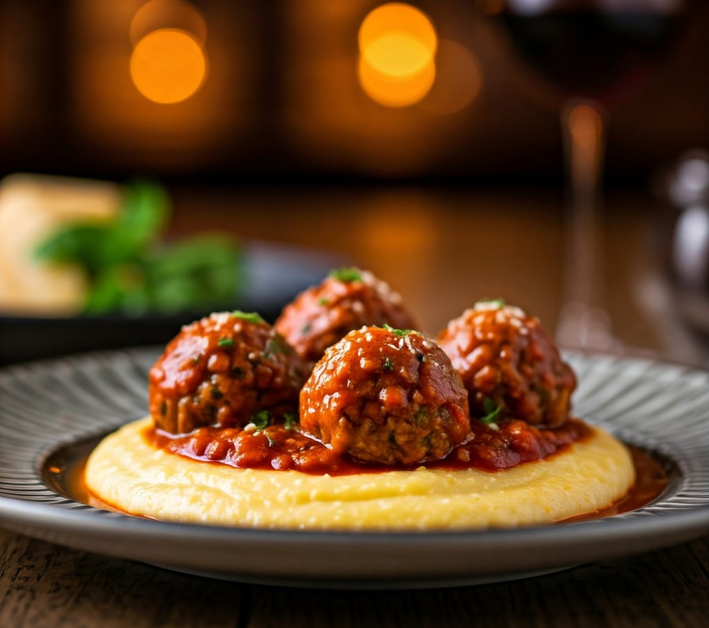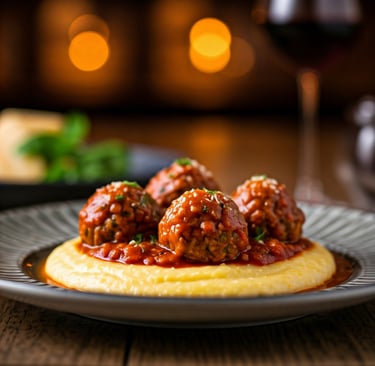 Um ragu profundo e saboroso servido sobre uma polenta cremosa, criando uma combinação perfeita de texturas.