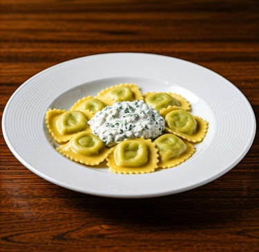 Delicados raviolis frescos, recheados com a cremosidade da ricota e o toque terroso do espinafre, dançam em um molho de manteiga dourada e sálvia aromática. Cada garfada é uma viagem à Itália, onde a simplicidade dos ingredientes se transforma em uma explosão de sabores. Cada ravioli é cuidadosamente moldado e cozido à perfeição, garantindo uma textura macia e um sabor irresistível. O molho de manteiga e sálvia envolve os raviolis em um abraço caloroso, enquanto o aroma da sálvia fresca transporta você para os campos da Toscana