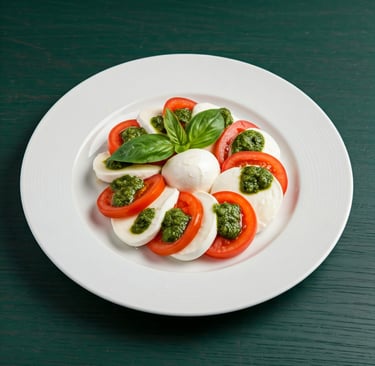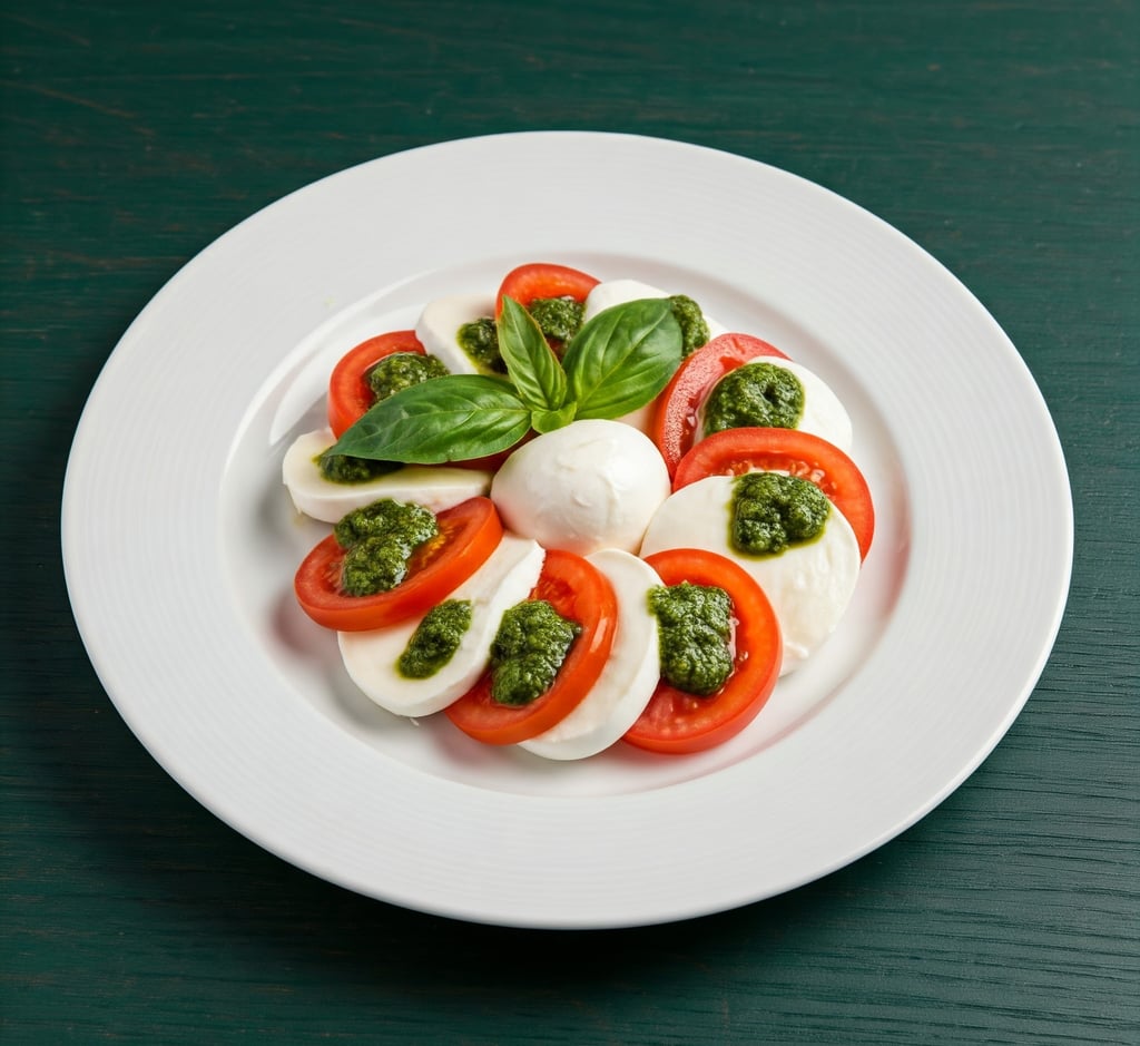 Uma versão elevada da clássica caprese, com um pesto fresco de manjericão e tomates maduros.