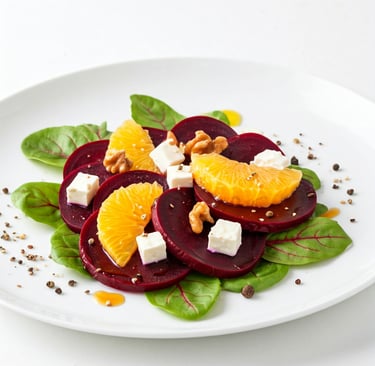 Uma salada vibrante e cheia de contrastes, com beterraba assada, laranja suculenta e feta cremoso.