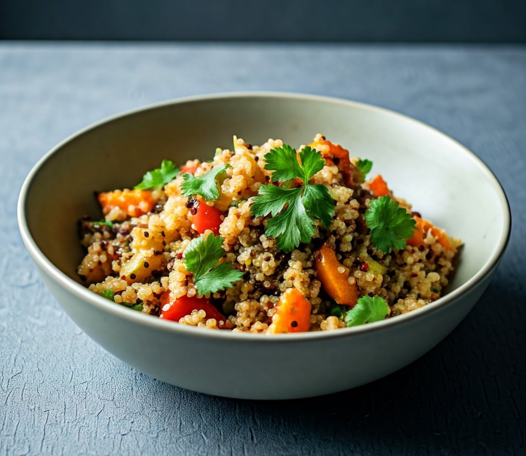 Após o arroz de quinoa e os legumes assados estarem prontos, misture tudo em uma tigela grande.
