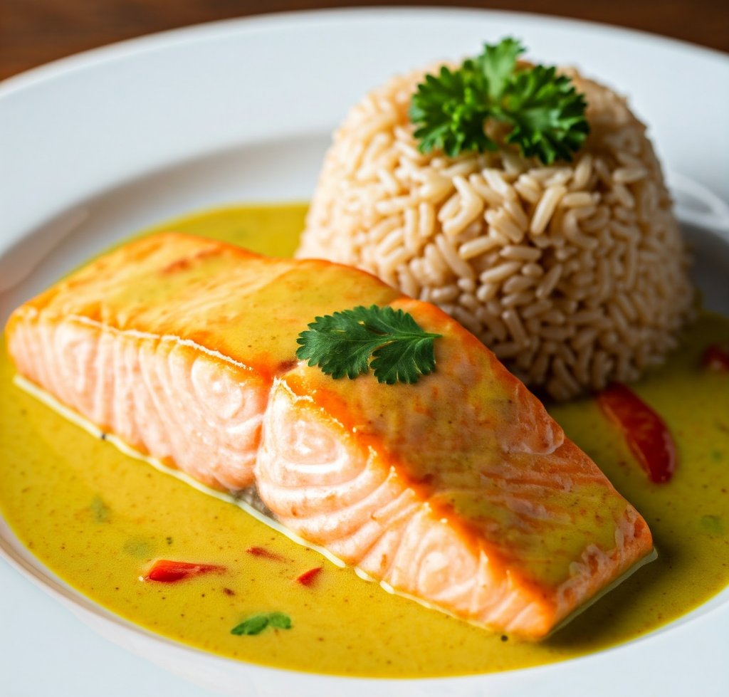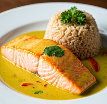 Salmão em Curry com Leite de Coco e Arroz Integral