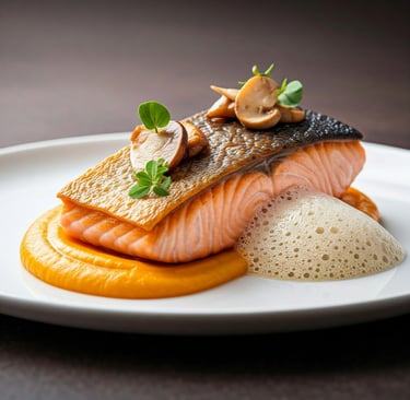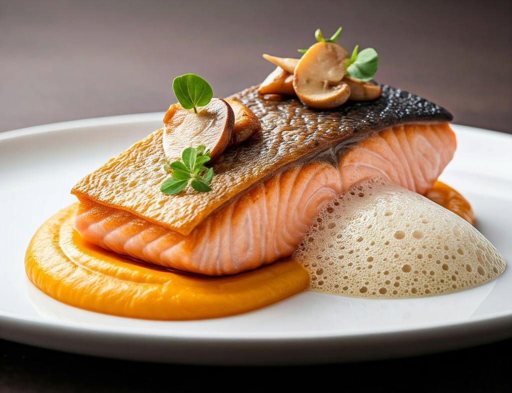 Salmão Selado com Purê de Abóbora e Espuma de Cogumelos