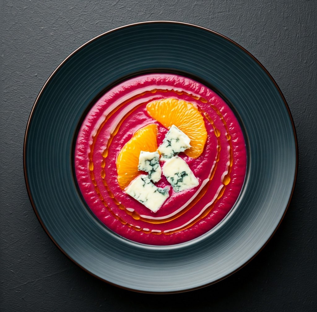 Uma sopa colorida e sofisticada, com o sabor terroso da beterraba, o frescor da laranja e o toque cremoso do gorgonzola.
