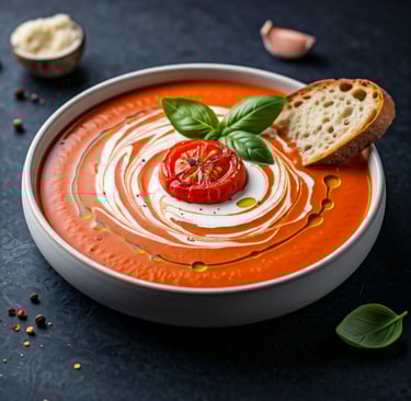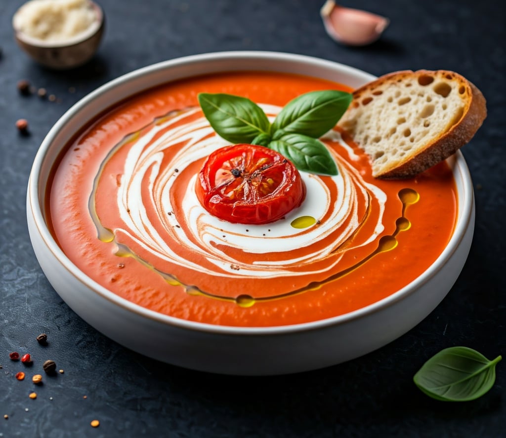 Uma sopa clássica, com tomates assados que realçam o sabor profundo e doce do tomate.