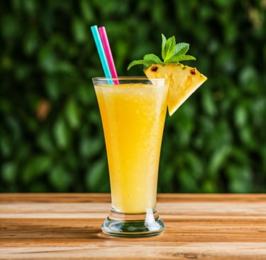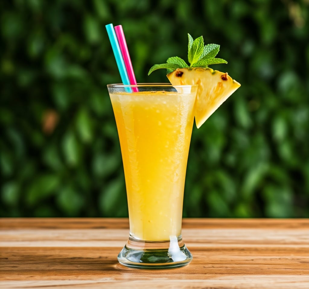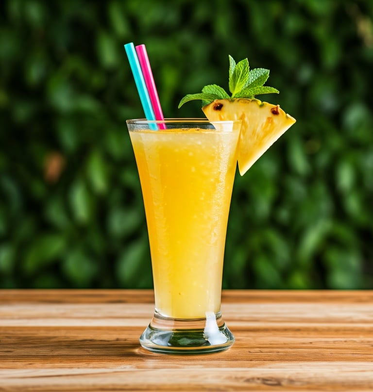 Guarnição: Decore o copo com: Uma fatia fina de abacaxi na borda, um ramo de hortelã fresca, uma pequena rodela de limão ou lima, gelo feito com ervas ou flores comestíveis congeladas dentro do cubo.