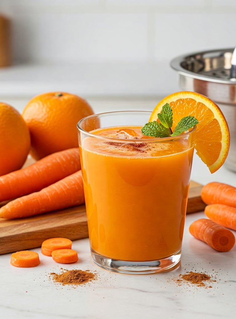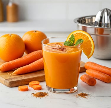 Combine com outras bebidas: Sirva o suco de laranja com cenoura como base para drinks saudáveis, como smoothies ou mocktails, adicionando outras frutas ou vegetais (ex.: beterraba ou maçã) em versões alternativas.