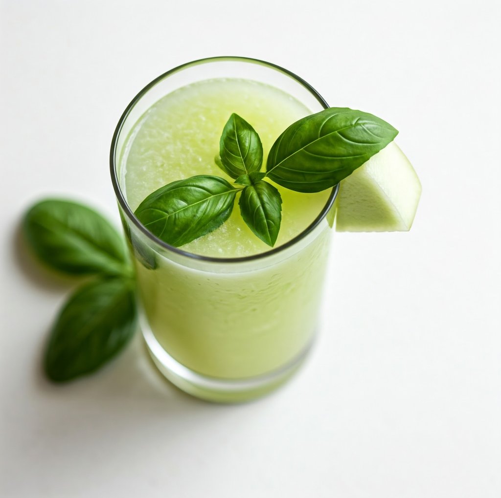 Bata o melão com a água de coco e as folhas de manjericão no liquidificador.
