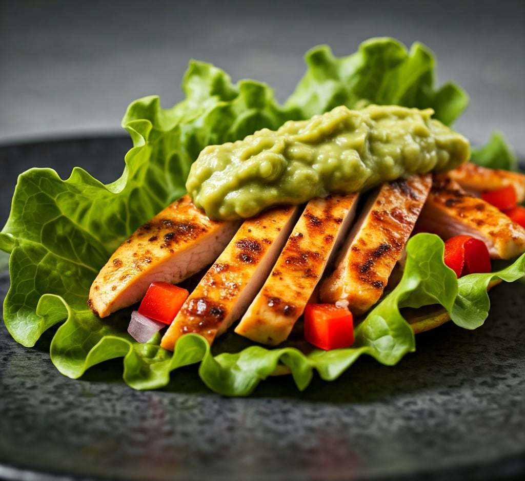 Monte os tacos com as folhas de alface, o frango desfiado e uma colher de guacamole.