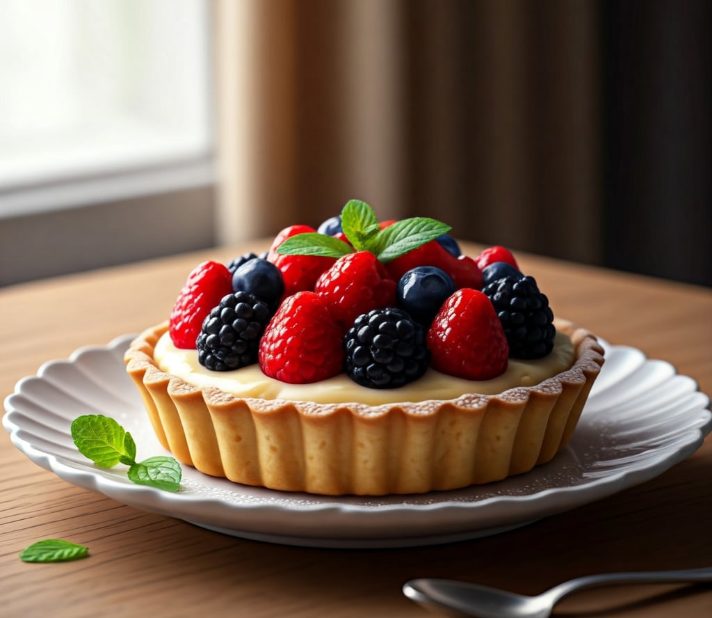 Montagem: Abra a massa e forre uma forma de tarte. Asse em forno pré-aquecido a 180°C por 15-20 minutos ou até dourar. Deixe esfriar completamente. Preencha com o creme de baunilha e decore com as frutas vermelhas frescas.