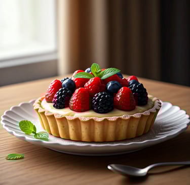 Uma tarte crocante com uma base de frutas vermelhas frescas e um creme suave de baunilha.
